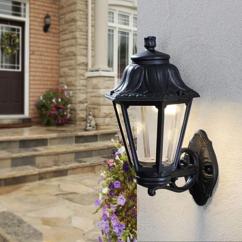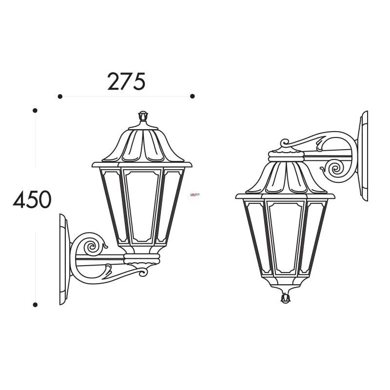 This black hexagonal lantern wall lamp in classic style, made in the shockproof resin material, UV rays stabilized, rust and corrosion-free. Modular construction is suitable for wall installation. Insulation class II, protection rating IP 55